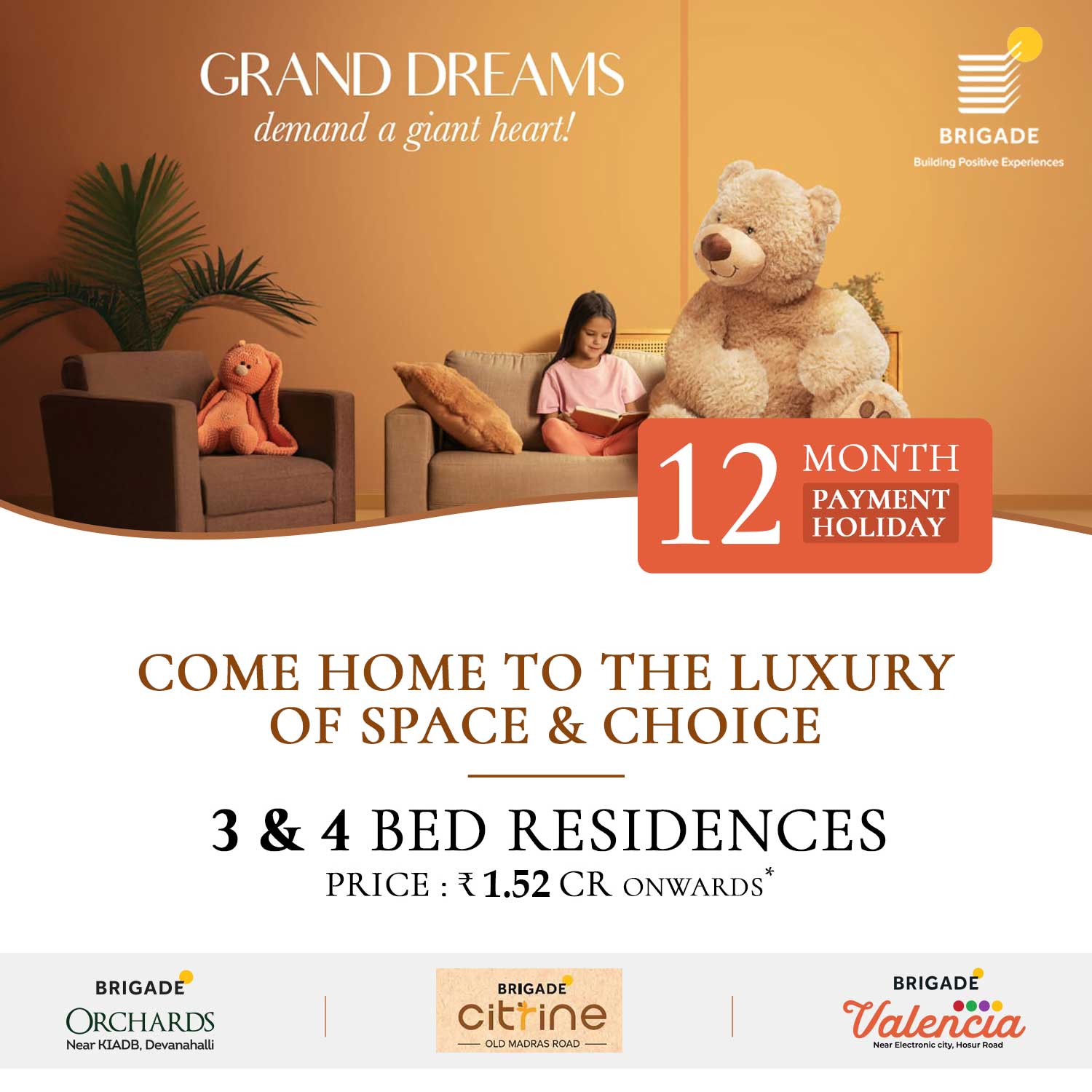 Brigade is a leading property developer in South India. Our Projects extend across several major cities in South India including Apartments and Villas in Bangalore, Chennai, Chikmagalur, Hyderabad, Kochi, Mangalore and Mysore. Explore Apartments in Bangalore, Apartments in Chennai and Hyderabad.